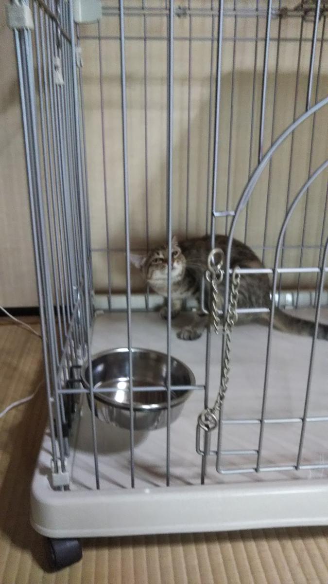 ヒョウちゃんを入れて撮ってみましたが、慣れないケージを嫌がっています。