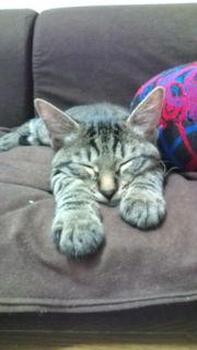 ついこの間までフローリングの上でグタッと横たわって涼んでいたのに、最近は座布団の上か、TVの真ん前でウトウト。(画面からの熱気が心地いいらしい)