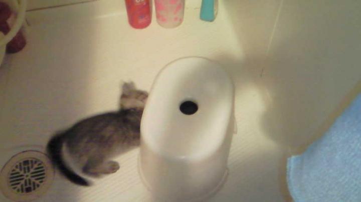 お風呂場で遊ぶ2匹、ココはお風呂のイスの中に潜り込んでます。