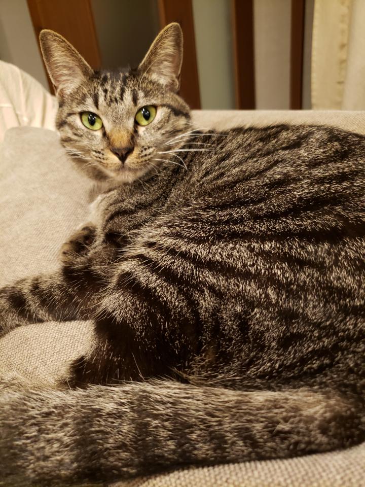 うちでは非常に動きにくそうでしたが、食欲もあり、うんちもよく出て、日に日に回復していきました。帰ってきたばかりは、やはり弱っている姿はみせたくない猫の性分か、ケージで丸くなっていましたね(TДT )