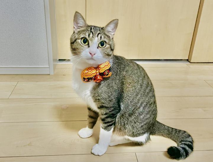 来月はハロウィンで少し早いけどボーに首輪つけてみた🎃