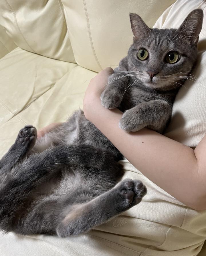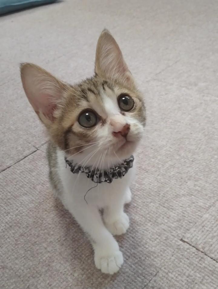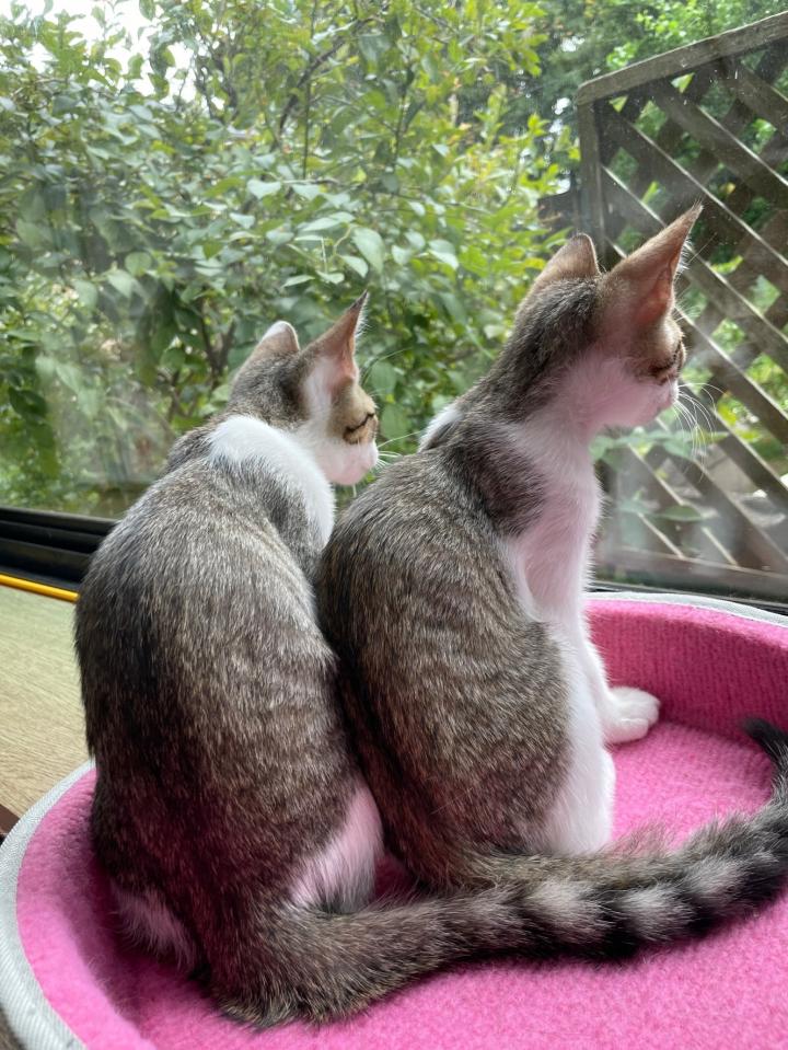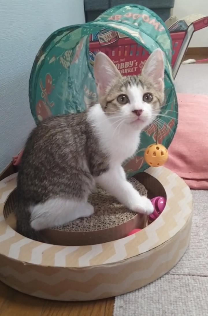 まだ怖がる素振りはみせますが、(ふと逃げる、身を隠す)家猫になる準備はもうばっちりです!