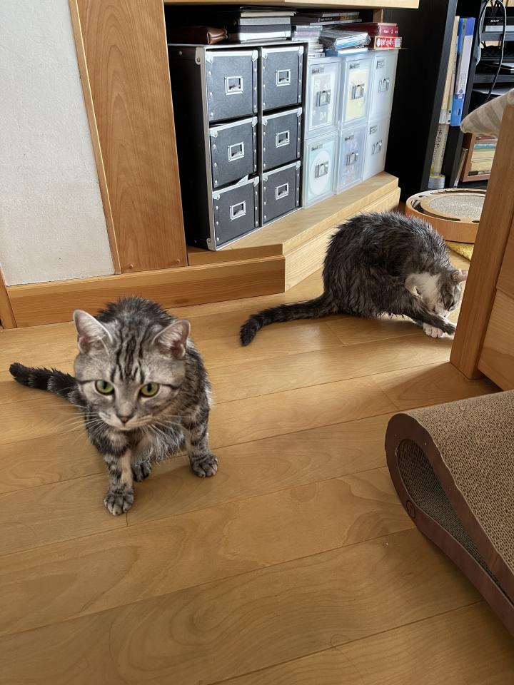 短毛種だから洗わなくていいかもなんですがぶんたがケモノ臭するのと、二匹ともダブルコートなので一回洗っておこうか…という感じで。