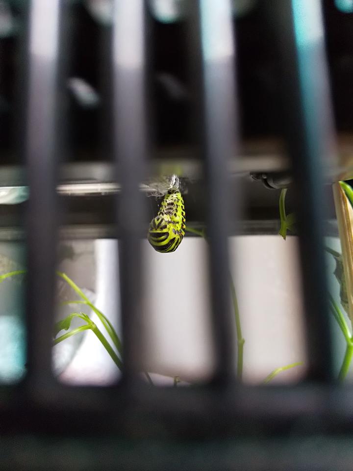 ケースの天井でわざわざ蛹になる準備を始めた幼虫…