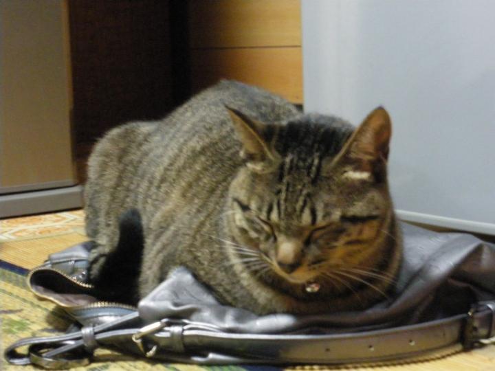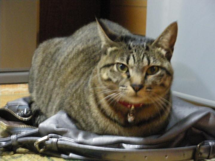 台所に置いてあったサバ缶のバックの上に座りました。