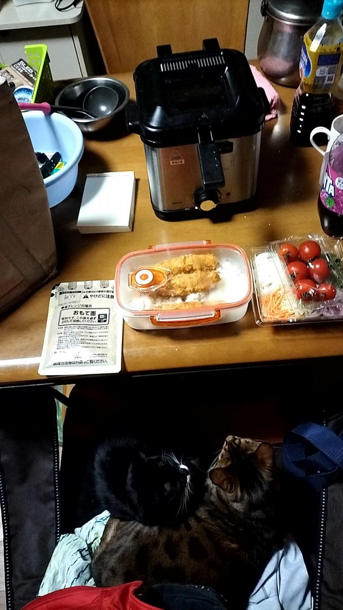 エビふりゃぁとレトルトカレーとサラダ持って!