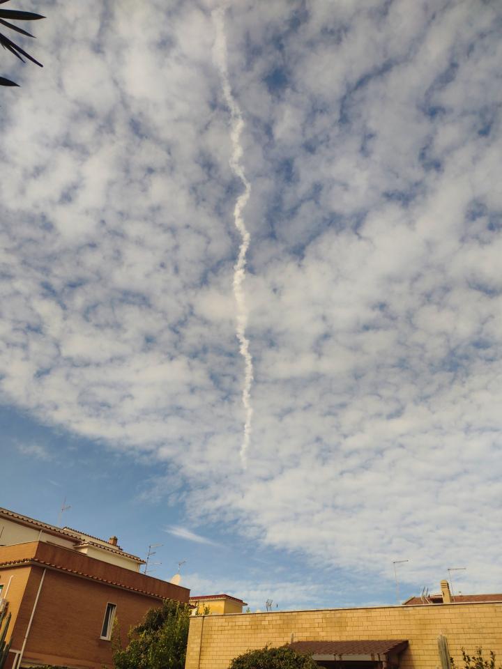 雲は多く、それを割るように浮かび上がる飛行機雲