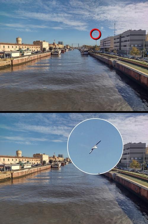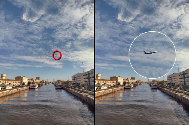 跳ね橋の反対方向を見て撮影…偶然ながら、飛行機とカモメがフレームイン\(^o^)/