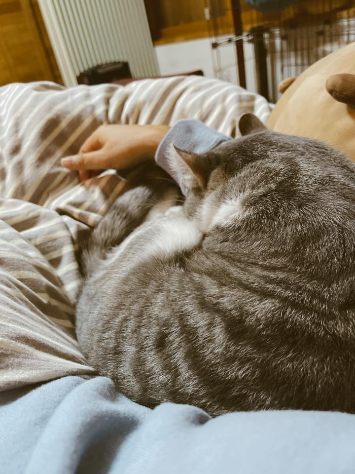 カラは布団をフミフミするのが好きでした。小さい頃に母猫と話された影響だったのかな、と今は分かります(ウールサッキングもありました)。