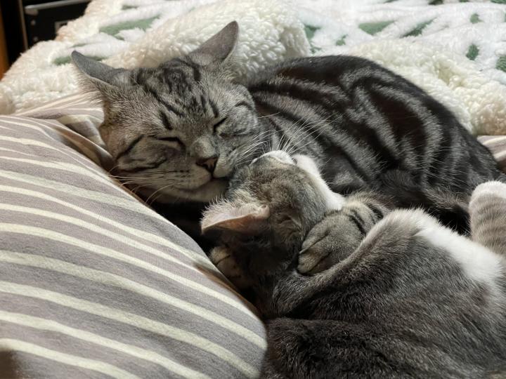 猫はカラと私が名付けた、コタローと同じくアメリカンショートヘアのシルバークラシックタビーで、私を妹分と思っている面倒見の良い子です。