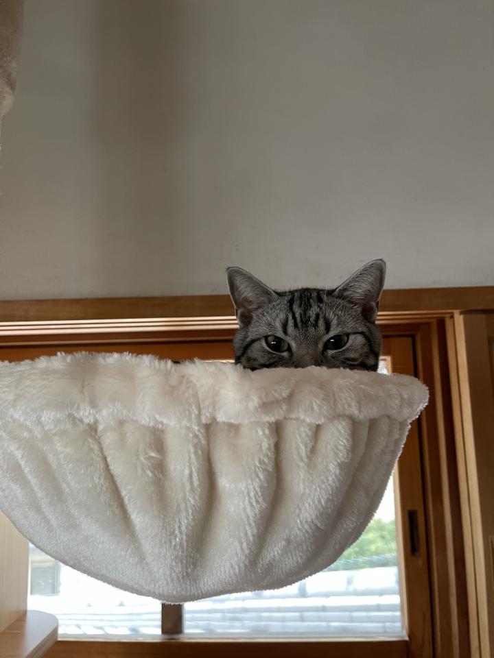 冬支度として透明ボウルの一つをぬくぬくハンモックに変えたところ、入ってくれました!ありがとう、甲斐がある…。