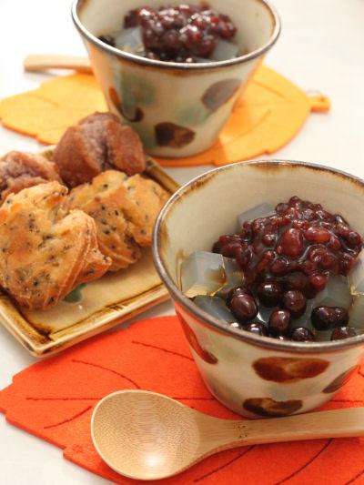 豆かんは粉寒天を煮固めて、豆は赤えんどう豆を炊いて