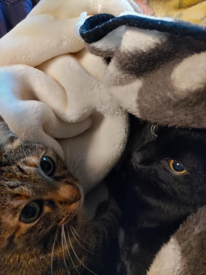 大好きなげんさんとベッドでぬくぬくしています。げんさんが私にくっついてベッドに入ってきて、そこにりんちゃんが乱入した形ですが(^_^;)