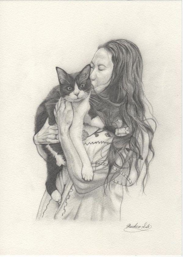 今回は女性に抱かれている白黒猫(♂)を描いた鉛筆画です。