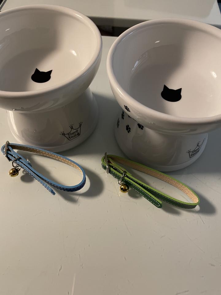 ご飯皿、水皿、首輪、ネコトイレと砂とシート、おもちゃとご飯とおやつとおもちゃ購入しました!