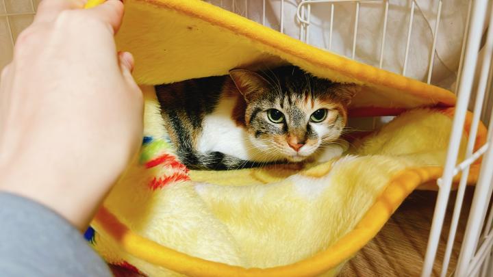 ぬいぐるみをひとつケージの中に持ち込み獲物ゲット!!という状態少し棚の上のものは持ちていましたが想定より控えめな被害、何より私を見た福ちゃんが申し訳無さそうな「怒られる…!?」みたいな顔で「にゃん…みゃお…」と鳴くので思わず笑ってしまいました。