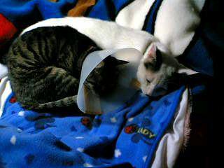 エリザベスカラーを装着したすーすー…いつものようにぶーぶに突進するのですが…カラーが邪魔で微妙な距離が…。