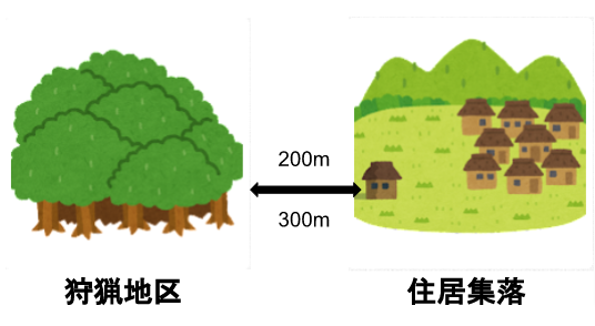 狩猟地区となる森と人家の距離、200m(イヌ)、300m(ネコ)離れていれば合法です。
