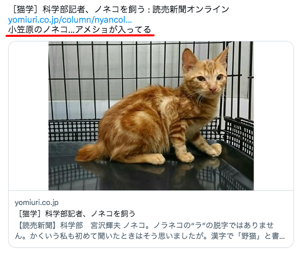 小笠原のノネコとして捕獲されたネコを飼う、読売新聞記者の記事がありました。