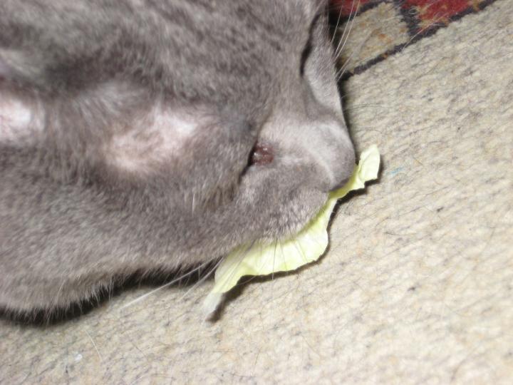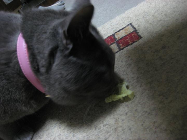 今回はキャベツを食べています。 うちはすぐダメになるホームセンターの猫草を買わないのですが、数年前のとある日、調理中に落ちてしまった菜っ葉を季々が食べているのを見てびっくり! その後どんな野菜を食べるか実験してみたところ、キャベツ・白菜・水菜・レタスを好んで食べることがわかりました。 だからと言ってどの部分でも食べるというわけではありません。 ふにゃふにゃはダメです! 程よく柔らかく、程よくシャキシャキ感もなくてはいけません! 嗜好にとてもうるさい季々です( ;∀;)