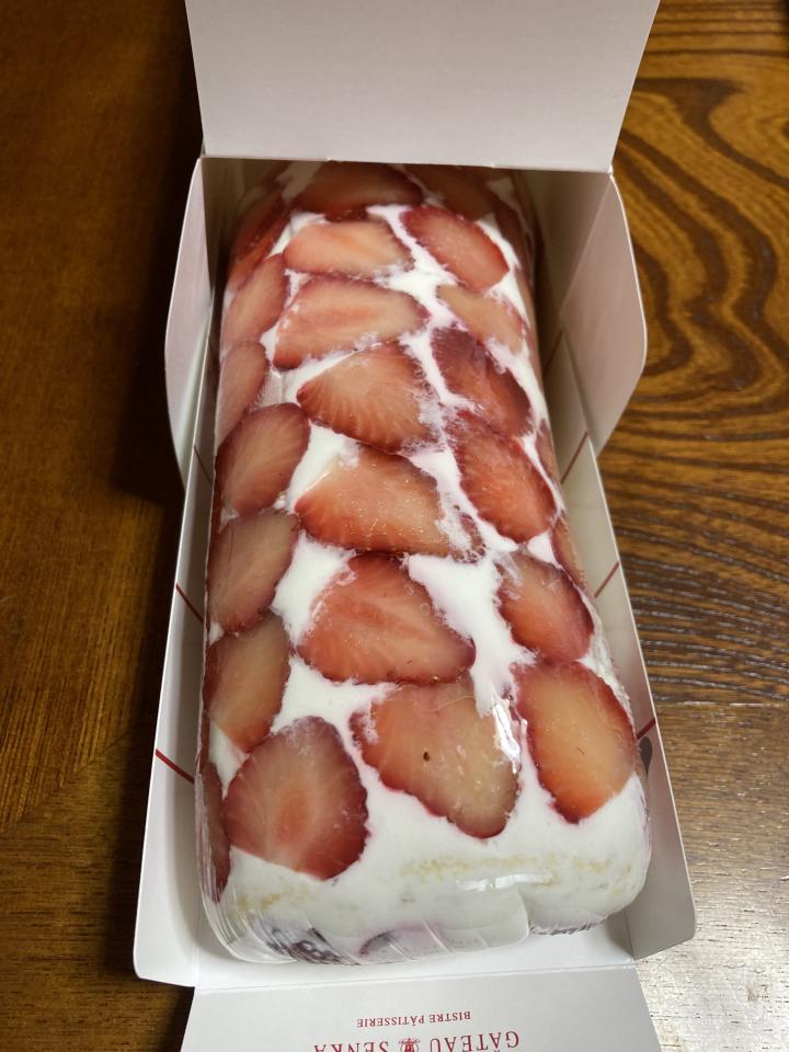 ラップごと切らないと上手く切れないイチゴのロールケーキ。