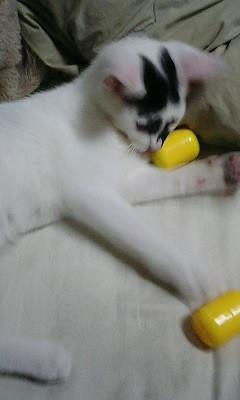 チョコエッグのおまけの入っていたカプセルで遊ぶブル