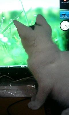 仕事中に膝に乗せたら、PCの画面の中の動くマウスが気になって画面の前に