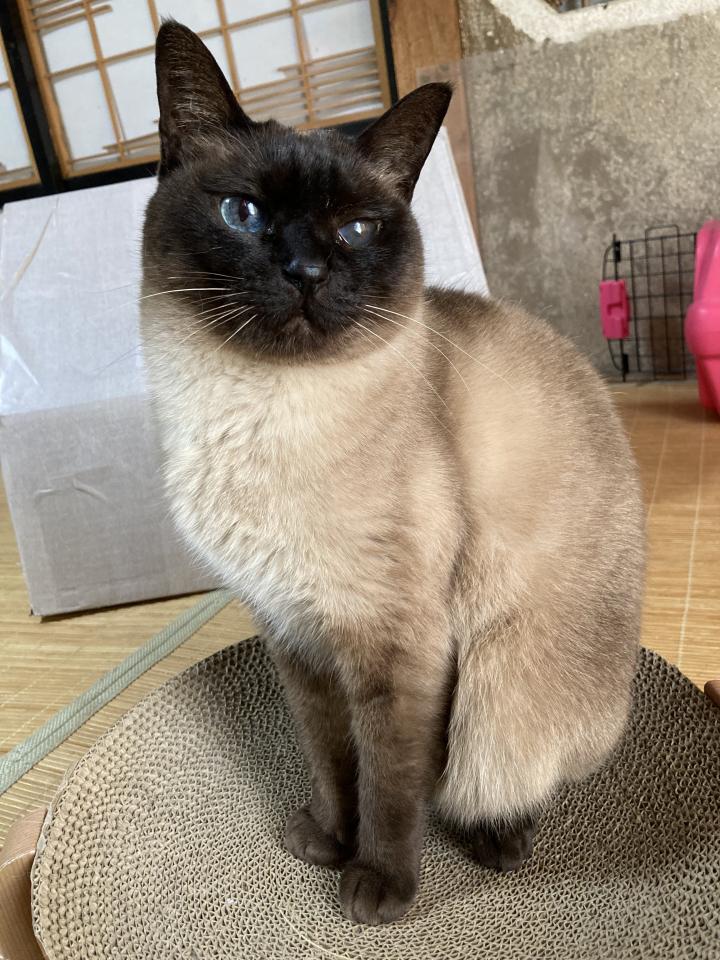 見えるかわかりませんが向かって眉間の悪い方の目寄りに白い毛が2本あります。