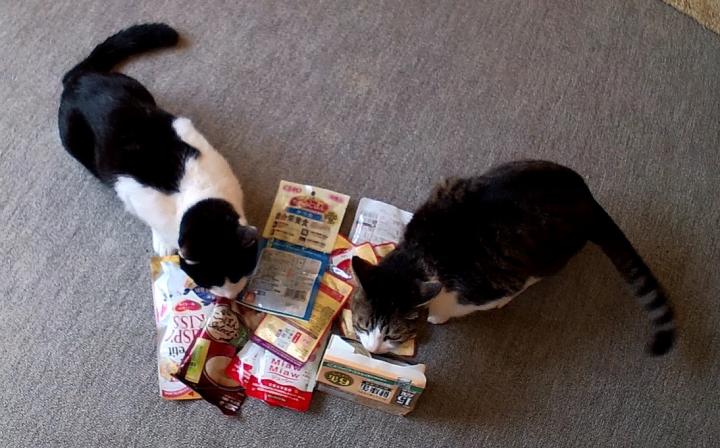 「落ち着け、七七保。えっと、まず前菜にこの液体のヤツと、それからこっちのレトルト…いや、やっぱり先に缶詰かニャ、その次に…。」