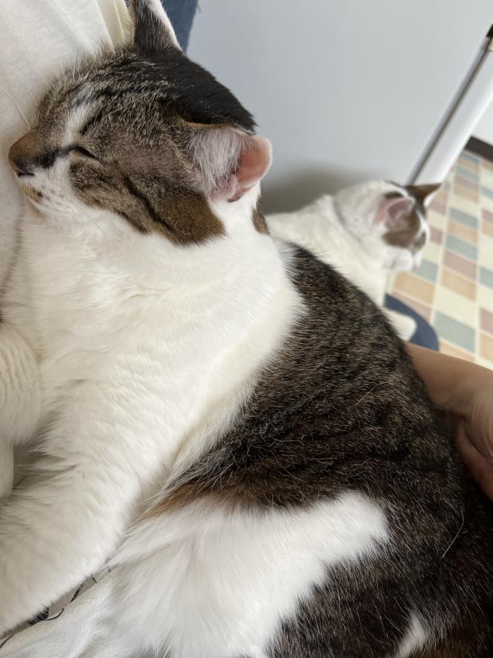膝に上り、肩に手を掛け安心して眠るみかん🍊