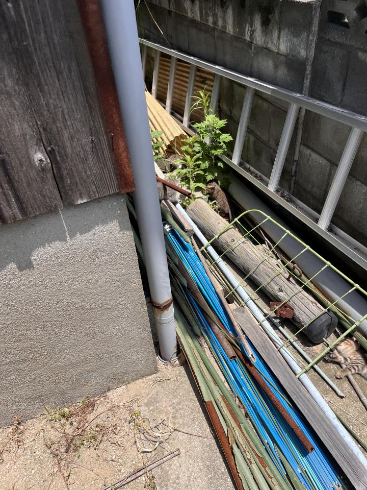 長屋のそばで、元気に走り回る子猫たちを発見しました。私たちを見て、蜘蛛の子を散らすように逃げていきましたが、1匹だけ木に挟まって逃げ遅れたちびっこがいました。