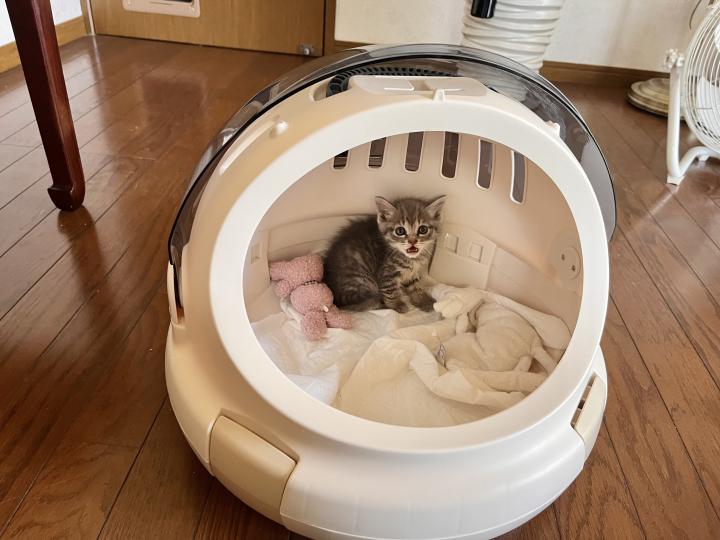 「ひとりでごめん。兄弟もすぐに連れて来るからね。」と声をかけ、初めはこんなに小さいのにと驚くくらい、大きなシャーとフーとカッ!でしたが、猫じゃらしで撫でたり、話しかけたりするうちに、3日くらいで抱っこできるようになりました。