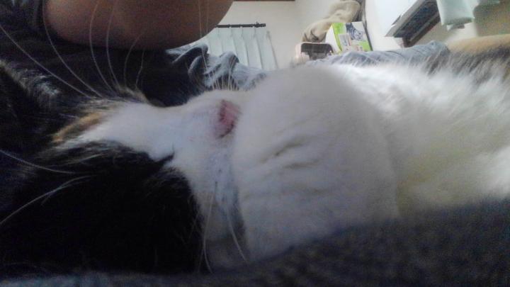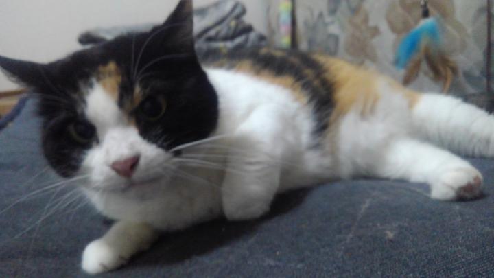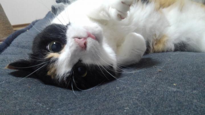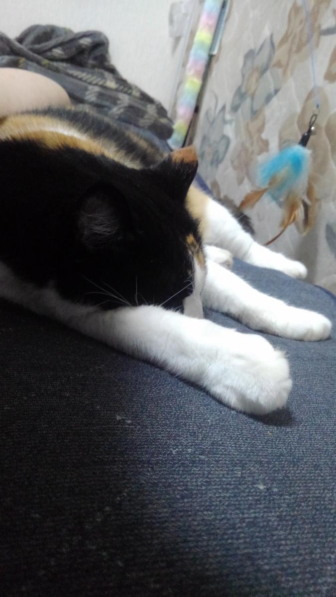 2018年2月、なついていた野良猫を飼う事にしました。 三毛の女の子です。 完全室内飼いしています。外に出たがったりしないので助かります。 抱っこは苦手だけど、添い寝は大好きな娘です。