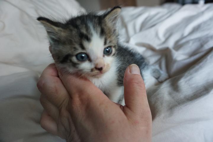 走り去っていたのはその後姿を見なかったのですが、ほかの猫と一緒にいた子はびしょぬれで弱弱しく泣いているのを道路わきで発見。しばらく様子を見ていますしたが、カラスが集まってきたので保護に踏み切りました。