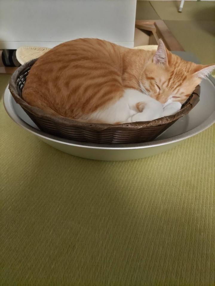 我が家の長男のふうくんはお気に入りのカゴで寝てますが…はみ出しそうな勢いで…これでまだ8ヶ月くらいとは笑