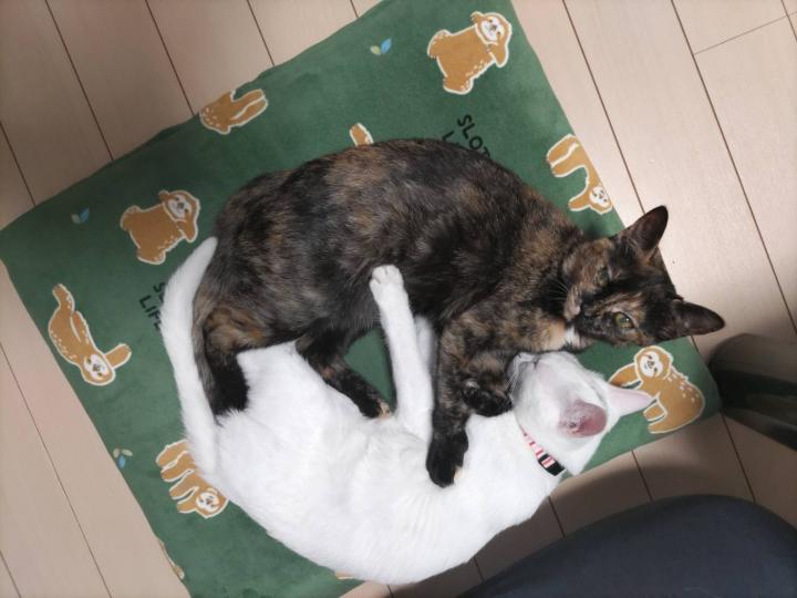 妹みたいな感じの2匹のりんちゃん(サビ)そらちゃん(白猫)はよりそってまるで姉妹みたく寝ちゃってます