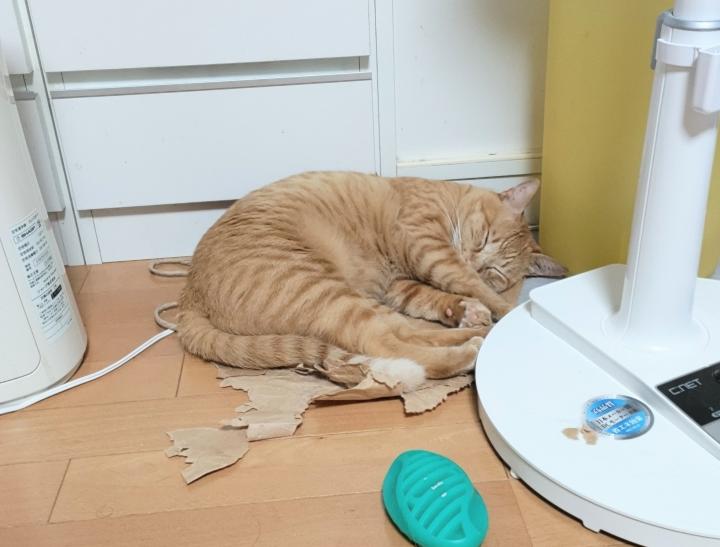 暑いせいかフカフカ猫ベッドで寝ないで、紙袋をビリビリに破り、いつもその上で寝るようになったのんた。