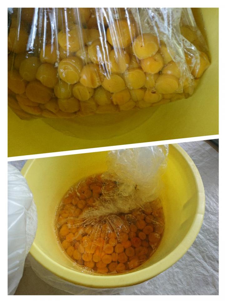 ⏩前もって、袋の中に塩とアルコールを少々いれ梅とまぜまぜし、空気を抜いて保存。