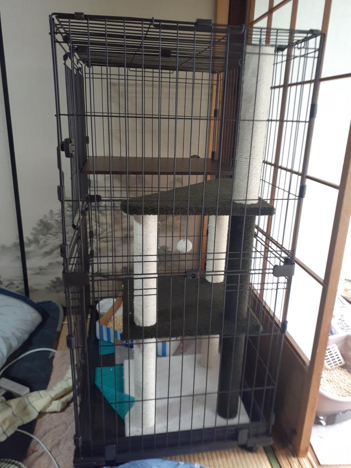 お気に入りのキャットタワーが入った、最近買ったばかりのケージが最近の寝床です。