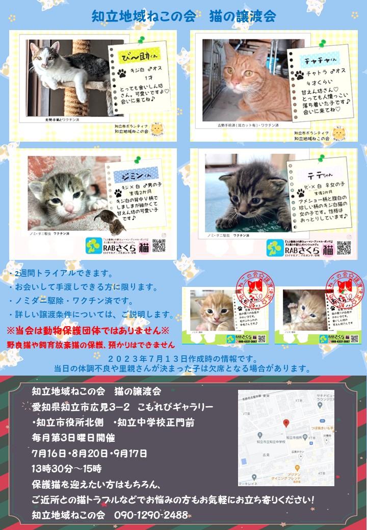 知立地域ねこの会 猫の譲渡会 愛知県知立市広見3-2 こもれびギャラリー 13時30分~15時