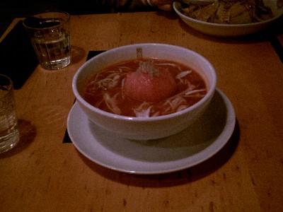 ラーメンの上には、湯剥きされたトマトが丸ごと乗っていて、スープは真っ赤。