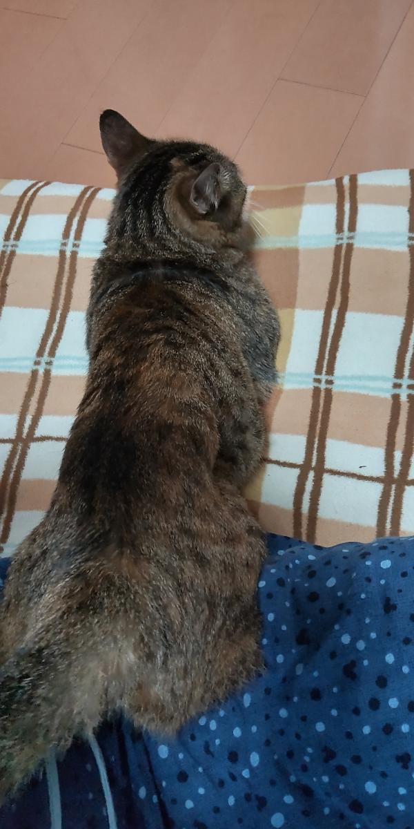 ナデナデされるか、お尻ポンポンされて、キキさんは尻尾で私の身体を尻尾でバシバシして、そこにいるのを確認してるようです。