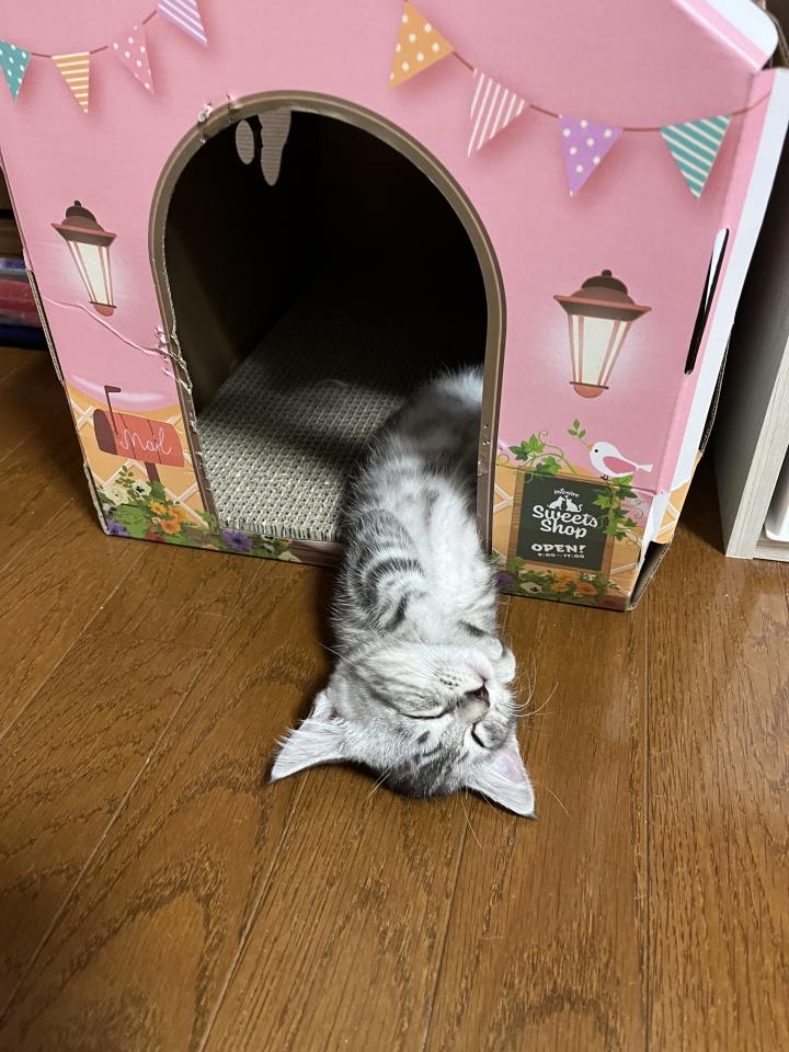 完全に我が家に慣れて爪研ぎ小屋から半分はみ出してヘソ天で寝るローマさん😴