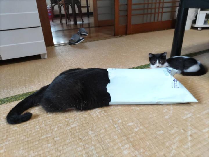 先住のお姉さん、てんさんと、袋の奪いあい。 ふくちゃんは、お姉さんが大好きなんだけど、いつもつれない、てん姉さん!