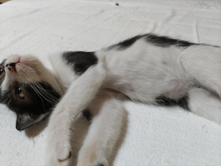 病院の先生に、ガリガリだからしっかり食べさせて下さい、と言われたので、欲しがるだけあげてたら、みるみる腹がこうなりました。次回の体重測定が楽しみ!