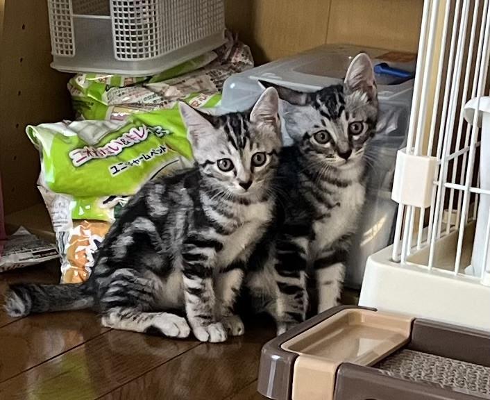 2023年7月下旬、生後約2ヶ月の仔猫をオスメス2匹もらいました。 田んぼの真ん中の農具小屋で産まれたノラ猫の子供。 猫を飼うのは30年ぶり、2匹同時飼いは初めてです。