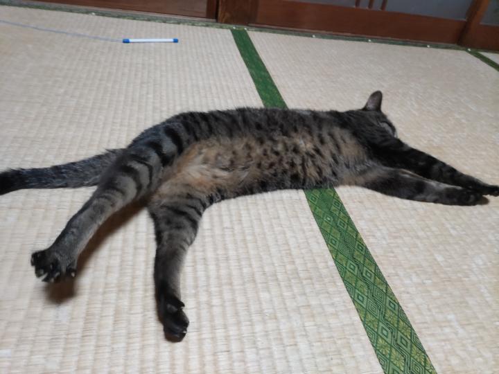 夜に先住外猫の、ガリ姉さんが帰って来た。福が来てから、夜は外で寝るようになってしまったが、疲れているのか気持ち良げに寝てる😊