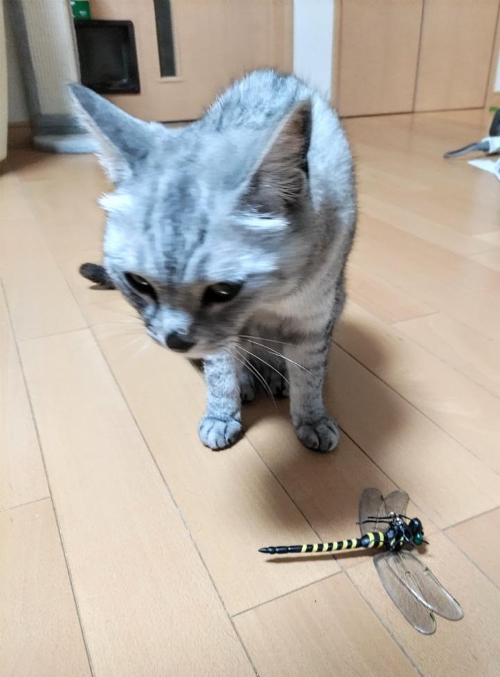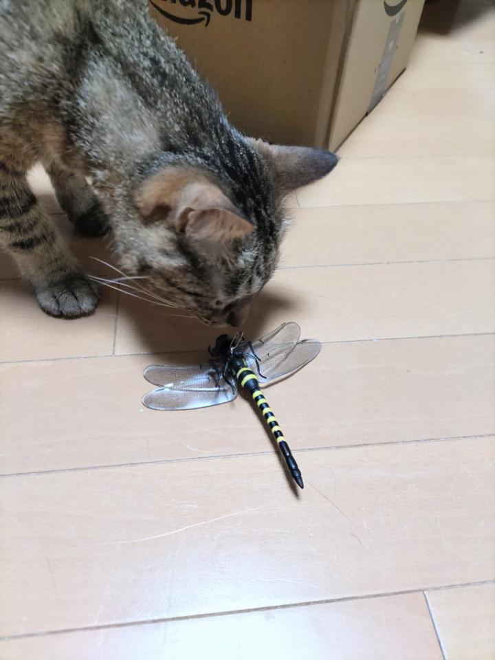 オニヤンマ君を見た途端、興味津々ワクワク!!でしたがクンクン臭いを嗅いだらなんかワケ分かんなくなっちゃったあんちゃん。