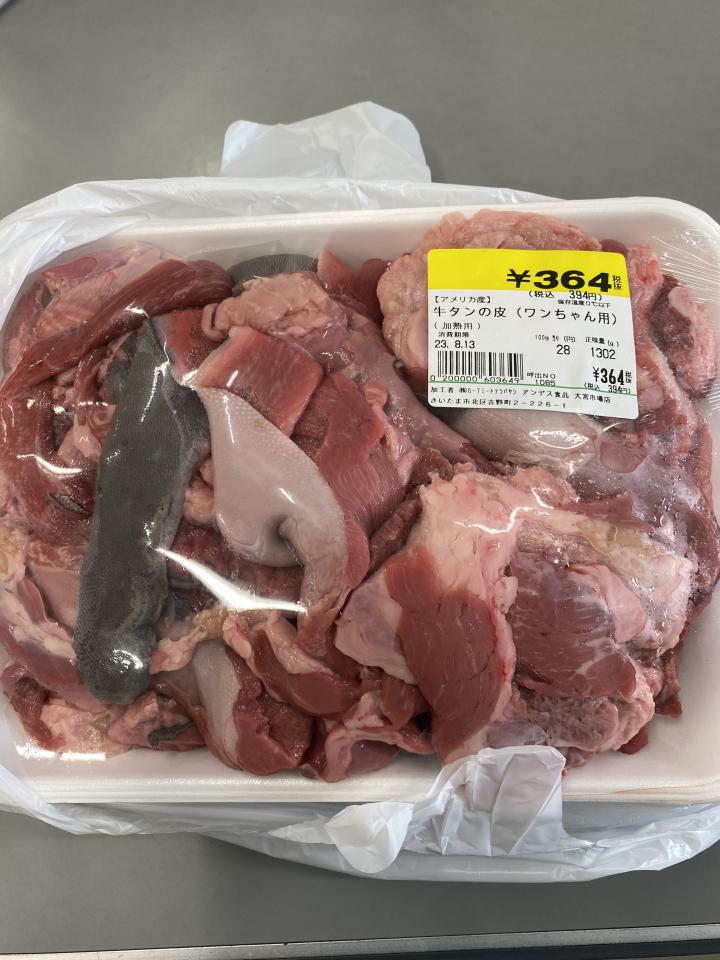 何とか食べてくれないかと悩んで居たら、市場内のお肉屋さんで『牛タンの皮(ワンちゃん用)』を発見