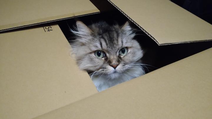 大きい段ボールが届いたので、早速入ってましたが、フィット感がいまいちだったらしく、すぐ出てしまいました